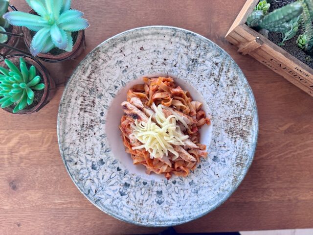 Izgara piliç fleto, pesto sos, napoliten sos ve rende kaşar ile…